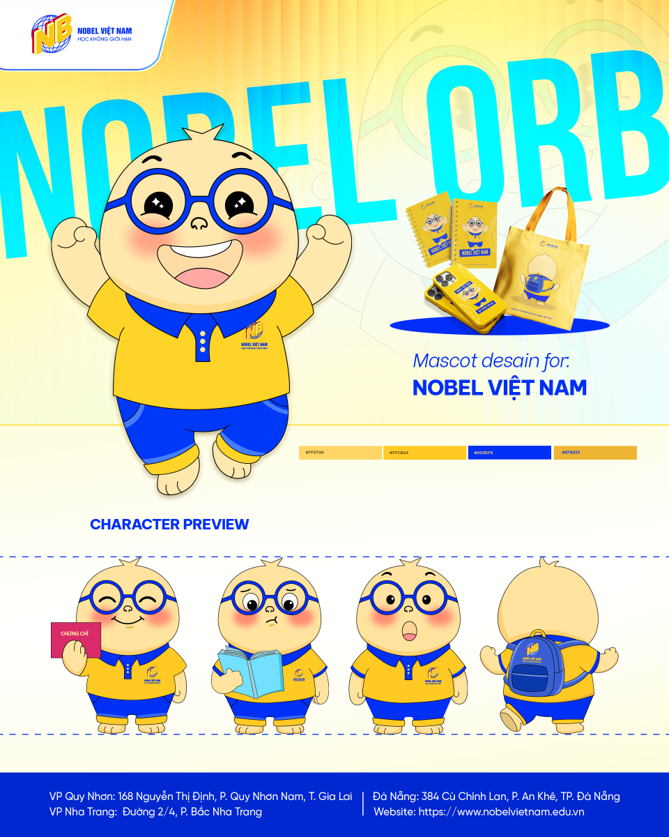 CHÍNH THỨC RA MẮT LINH VẬT CỦA NOBEL VIỆT NAM - THE NOBEL ORB (NOBE) Thứ bảy,25/04/2026 5 Lượt xem CHÍNH THỨC RA MẮT LINH VẬT CỦA NOBEL VIỆT NAM - THE NOBEL ORB (NOBE) Sau bao ngày chờ đợi, đại gia đình Nobel Việt Nam vô cùng tự hào được giới thiệu "mảnh ghép" mới nhất trên hành trình truyền cảm hứng học tập của chúng ta: THE NOBEL ORB - Tên gọi thân thương, bé NOBE (No-bi) Nobe mang hình dáng của một quả cầu tri thức, từ "Orb" được lấy cảm hứng từ "Orbis" (sự tuần hoàn/vòng tròn hoàn hảo), mang ý nghĩa rằng việc học tập là một hành trình trọn vẹn và không ngừng nghỉ. Nobe ra đời để đại diện cho chính giá trị cốt lõi của Nobel Việt Nam - Là người bạn đồng hành, giúp bạn tìm ra định hướng công việc phù hợp, cùng các khoá học chất lượng, giúp học viên nâng cao kỹ năng chuyên môn và nhận về những chứng chỉ đầy tự hào Trong thời gian sắp tới, hình ảnh của Nobe sẽ phủ sóng trên các ấn phẩm truyền thông, sự kiện và đồng hành cùng các bạn từ những bước tư vấn đầu tiên cho đến khi tốt nghiệp. Hy vọng người bạn nhỏ bé, thông tuệ và đầy nhiệt huyết này sẽ luôn là điểm tựa vững chắc, nhận được sự yêu thương của tất cả các học viên. Hãy cùng chào đón NOBE - Biểu tượng của tri thức và định hướng tương lai từ Nobel Việt Nam nhé cả nhà ơi ! ---------- NOBEL VIỆT NAM - HỌC KHÔNG GIỚI HẠN Trụ sở Đà Nẵng: 384 Cù Chính Lan, Phường An Khê, Thành phố Đà Nẵng Văn phòng Quy Nhơn: 168 Nguyễn Thị Định, Phường Quy Nhơn Nam, tỉnh Gia Lai Hotline: 093 139 8181 #nobelvietnam #nghiepvusupham #giaovien #chungchi #mascot #nobe nobel việt nam, nghiệp vụ sư phạm , mascot