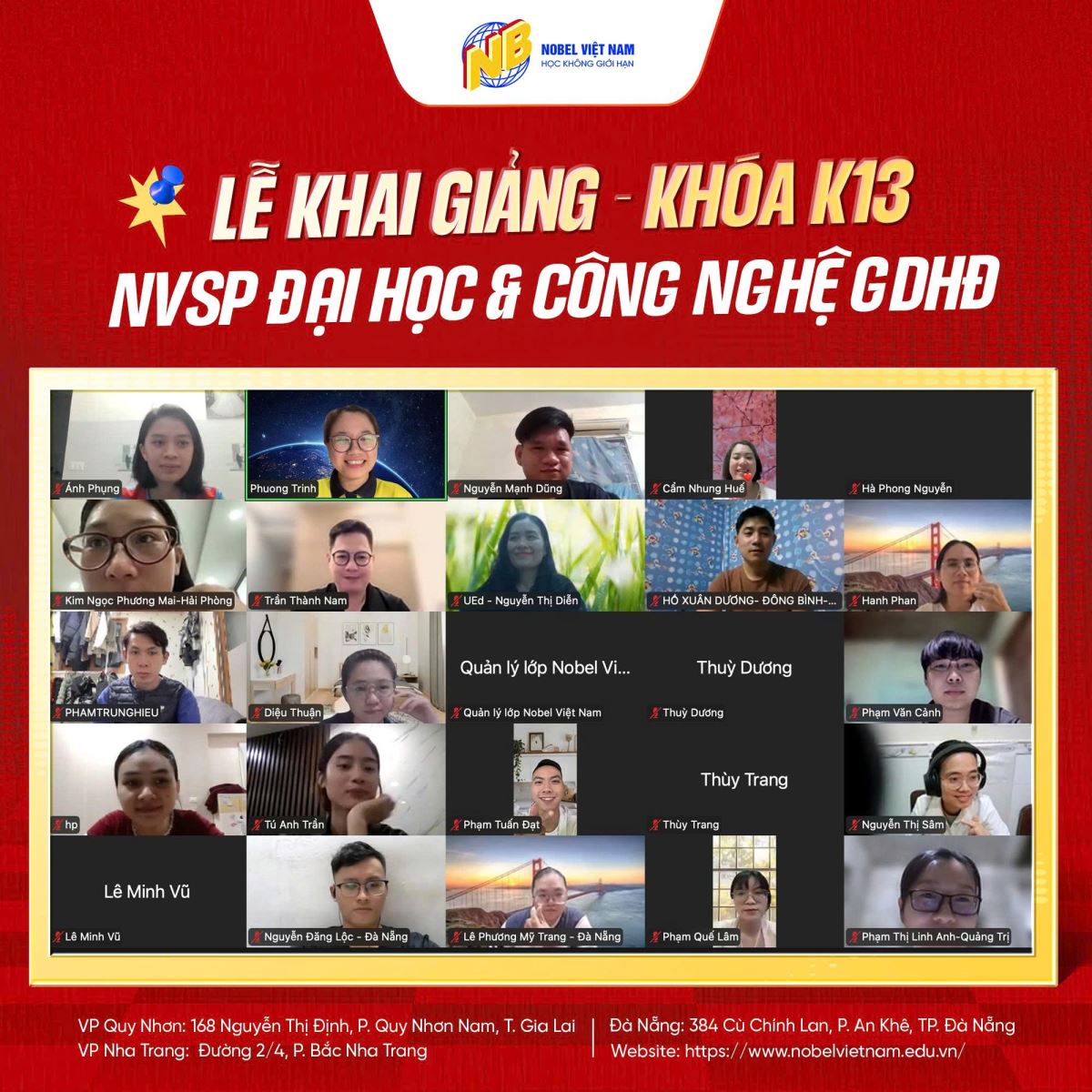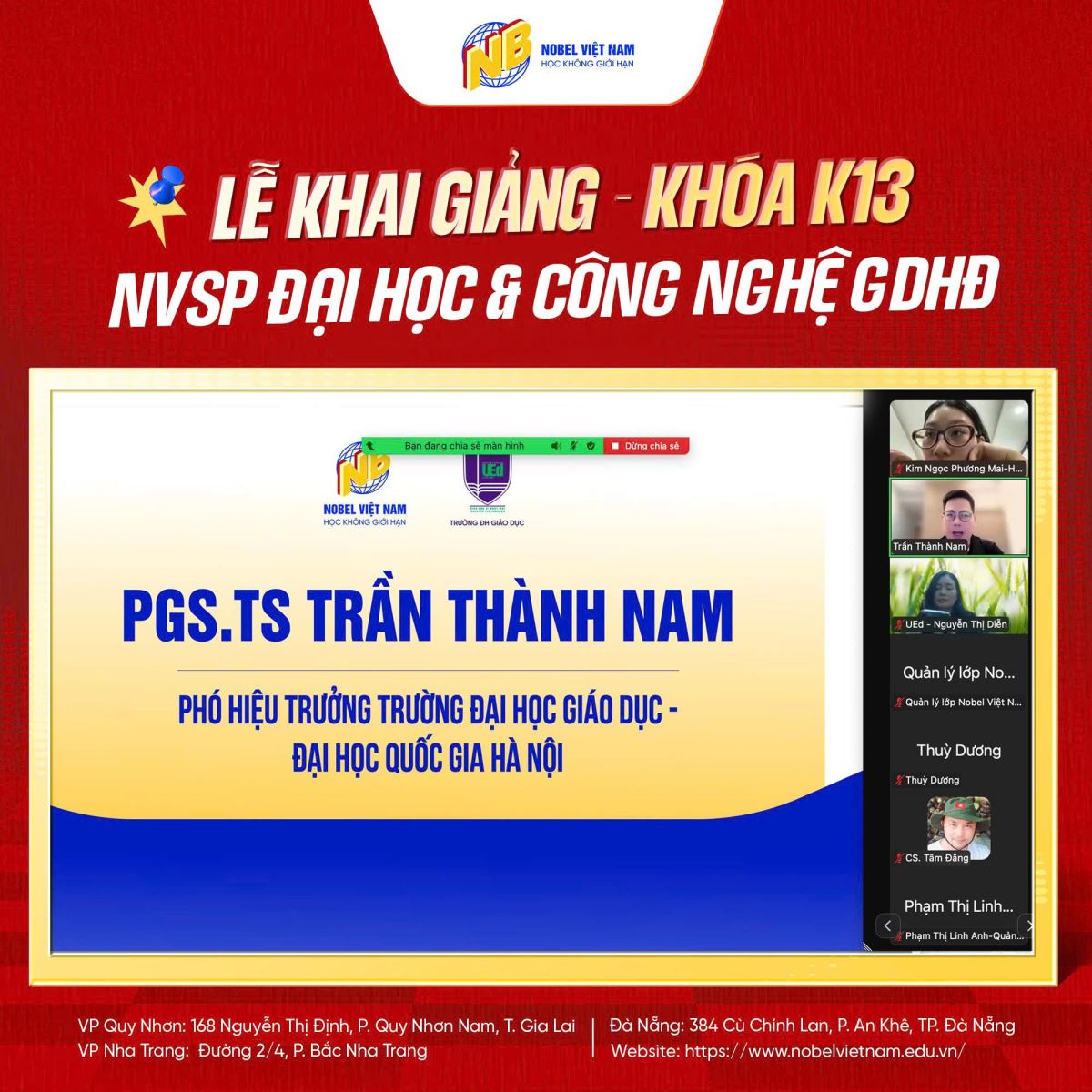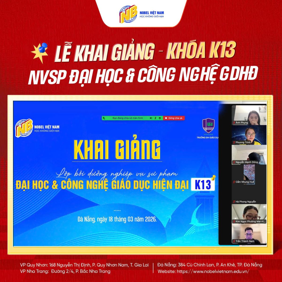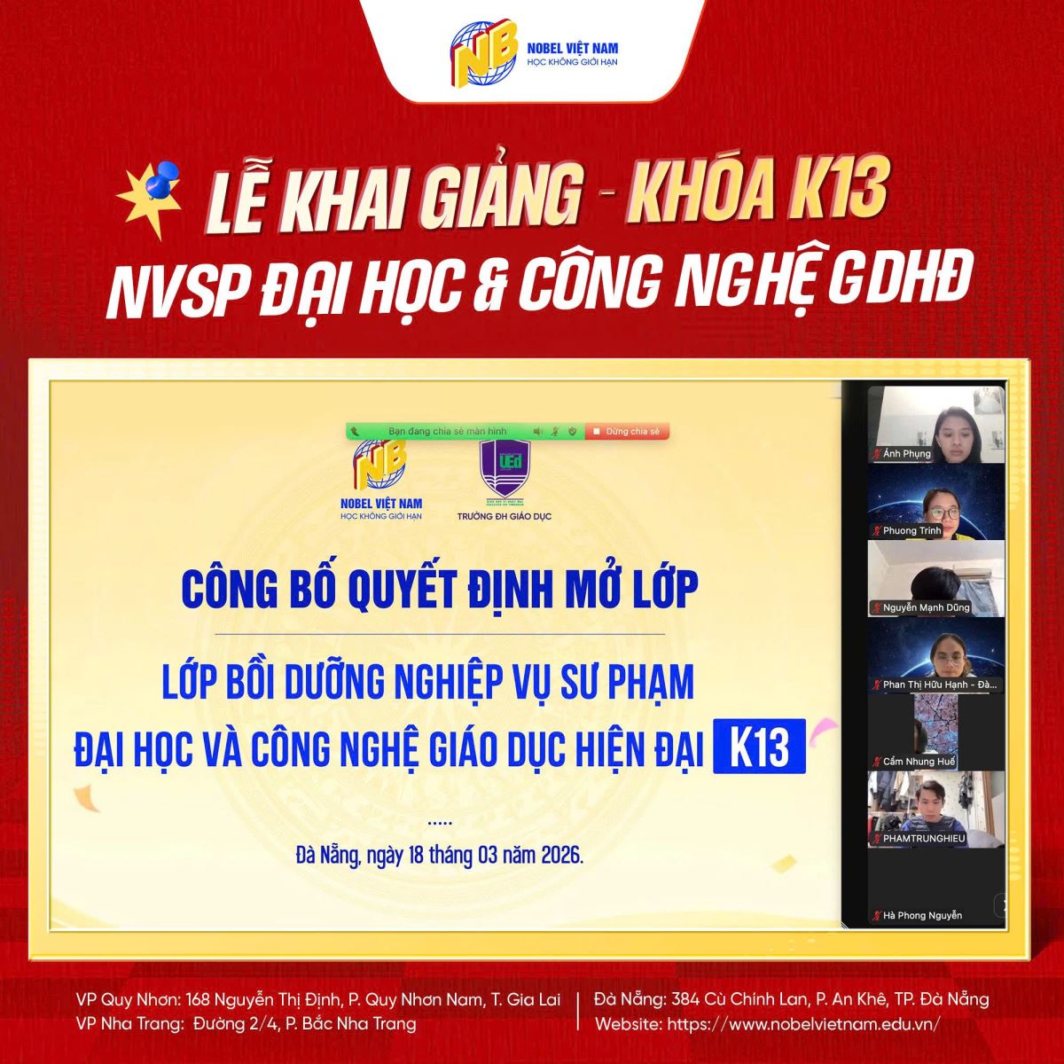 KHAI GIẢNG LỚP NGHIỆP VỤ SƯ PHẠM ĐẠI HỌC VÀ CÔNG NGHỆ GIÁO DỤC HIỆN ĐẠI K13 Thứ bảy,21/03/2026 7 Lượt xem KHAI GIẢNG Lớp Nghiệp vụ sư phạm Đại học và công nghệ giáo dục hiện đại K13 18/3/2026 vừa qua Nobel Việt Nam cùng trường ĐH Giáo dục - ĐH Quốc Gia Hà Nội đã tổ chức thành công buổi lễ khai giảng cùng hơn 60 bạn học viên Là dịp để các bạn học viên hiểu hơn về đơn vị mình đăng ký và học tập, cùng lắng nghe những chia sẻ từ 2 đơn vị, sẵn sàng để bắt đầu một hành trình học tập mới đầy thú vị và bổ ích. Nobel Việt Nam xin cảm ơn quý thầy cô nhà trường đã thu xếp thời gian tham gia khai giảng cùng lớp Cảm ơn các bạn học viên đã tin tưởng lựa chọn Nobel Việt Nam. Chúc các bạn học tập thuận lợi và công tác tốt nghiệp vụ sư phạm , nobel việt nam, đại học và công nghệ giáo dục hiện đại