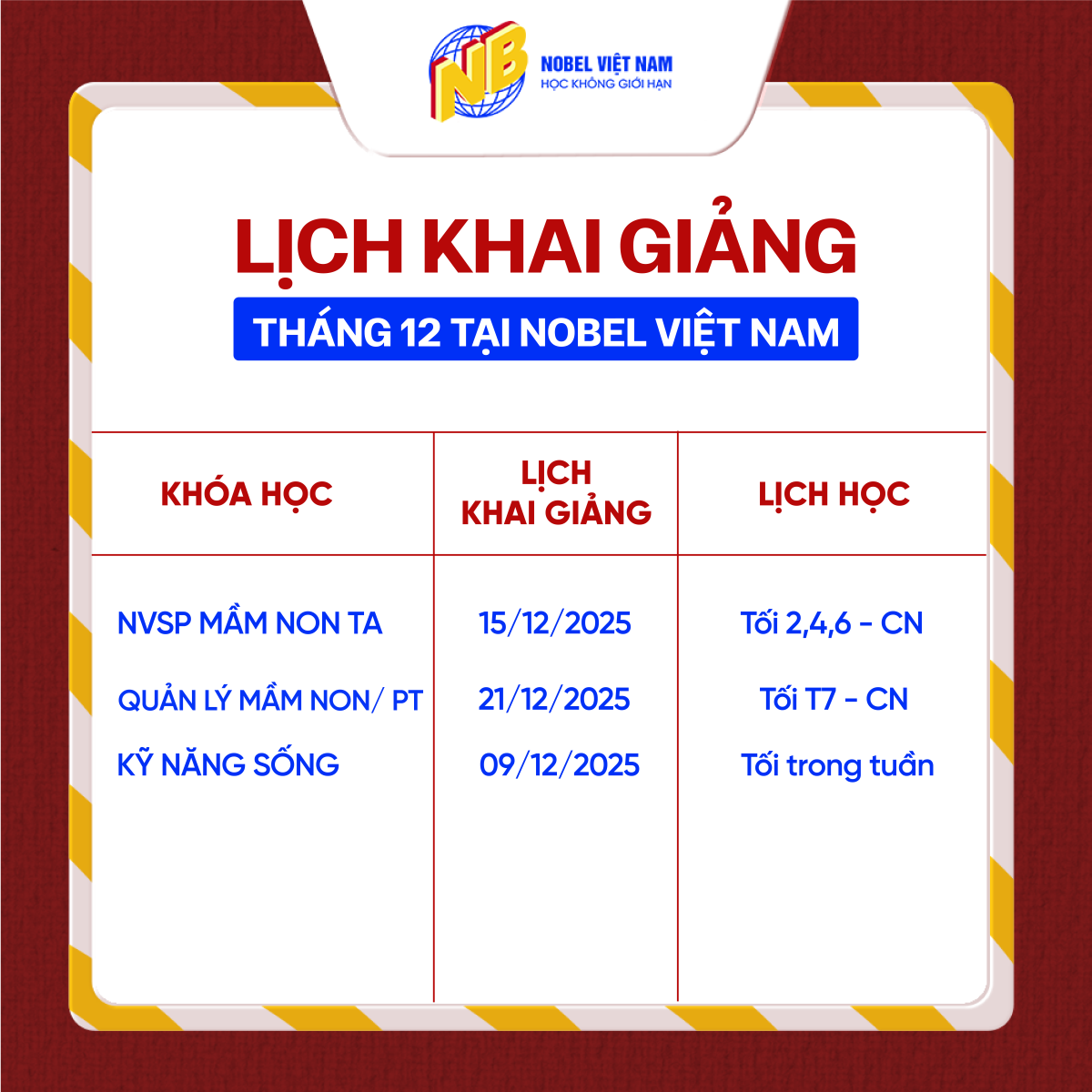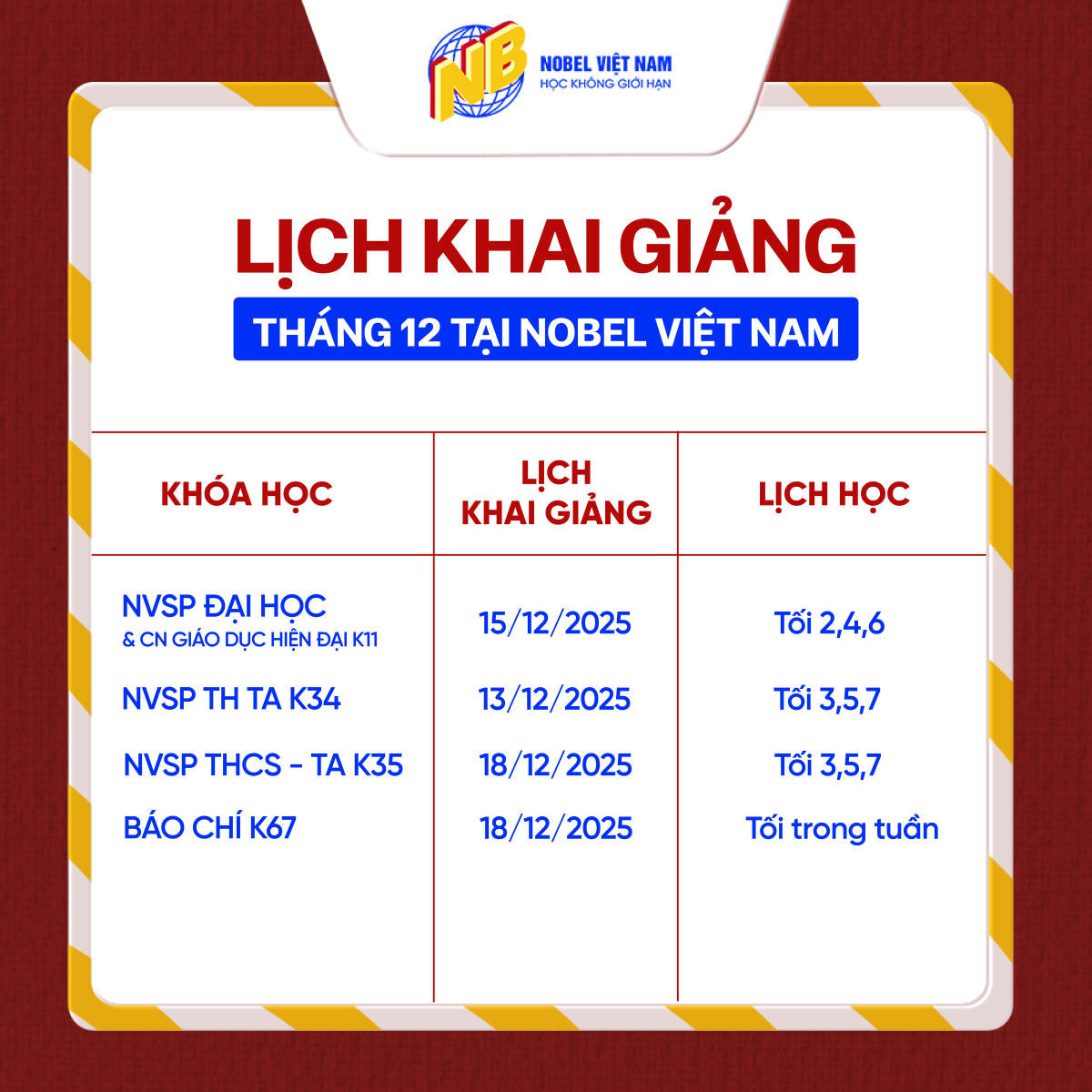 LỊCH KHAI GIẢNG CÁC LỚP NGHIỆP VỤ SƯ PHẠM THÁNG 12/2025 Thứ tư,03/12/2025 31 Lượt xem Giáng Sinh gõ cửa rồi, còn Nobel Việt Nam thì… mở cửa đón bạn vào lớp Nghiệp vụ Sư phạm rực rỡ năng lượng cuối năm Nếu bạn đang ấp ủ giấc mơ đứng lớp, thì đây chính là thời điểm phù hợp nhất dành cho bạn. Sẵn sàng cho mùa tuyển dụng năm 2026, mọi may mắn đều đến từ sự chuẩn bị cẩn thận, đừng để cơ hội đến rồi lại vụt đi trong tiếc nuối Bạn chỉ cần chọn lớp phù hợp → còn lại để Nobel lo Tháng 12 rồi tăng tốc thôi, đừng do dự nữa bạn nhé ! .-.-.-.-.-.-.-.-.-.-.-.-.- Hotline: 093 139 8181 Trụ sở chính: 384 Cù Chính Lan, Quận Thanh Khê, Đà Nẵng Văn phòng: 168 đường Nguyễn Thị Định, Phường Nguyễn Văn Cừ, Thành phố Qui Nhơn, Bình Định #nobelvietnam #nghiepvusupham #chungchi #giaovien nobel việt nam, nghiệp vụ sư phạm , lịch khai giảng , giáo viên, chứng chỉ