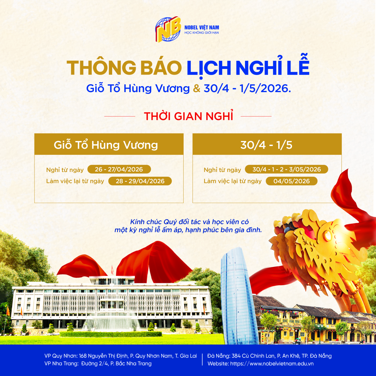 Nobel Việt Nam trân trọng thông báo lịch nghỉ lễ Giỗ Tổ Hùng Vương, 30/4 và 1/5 năm 2026:
